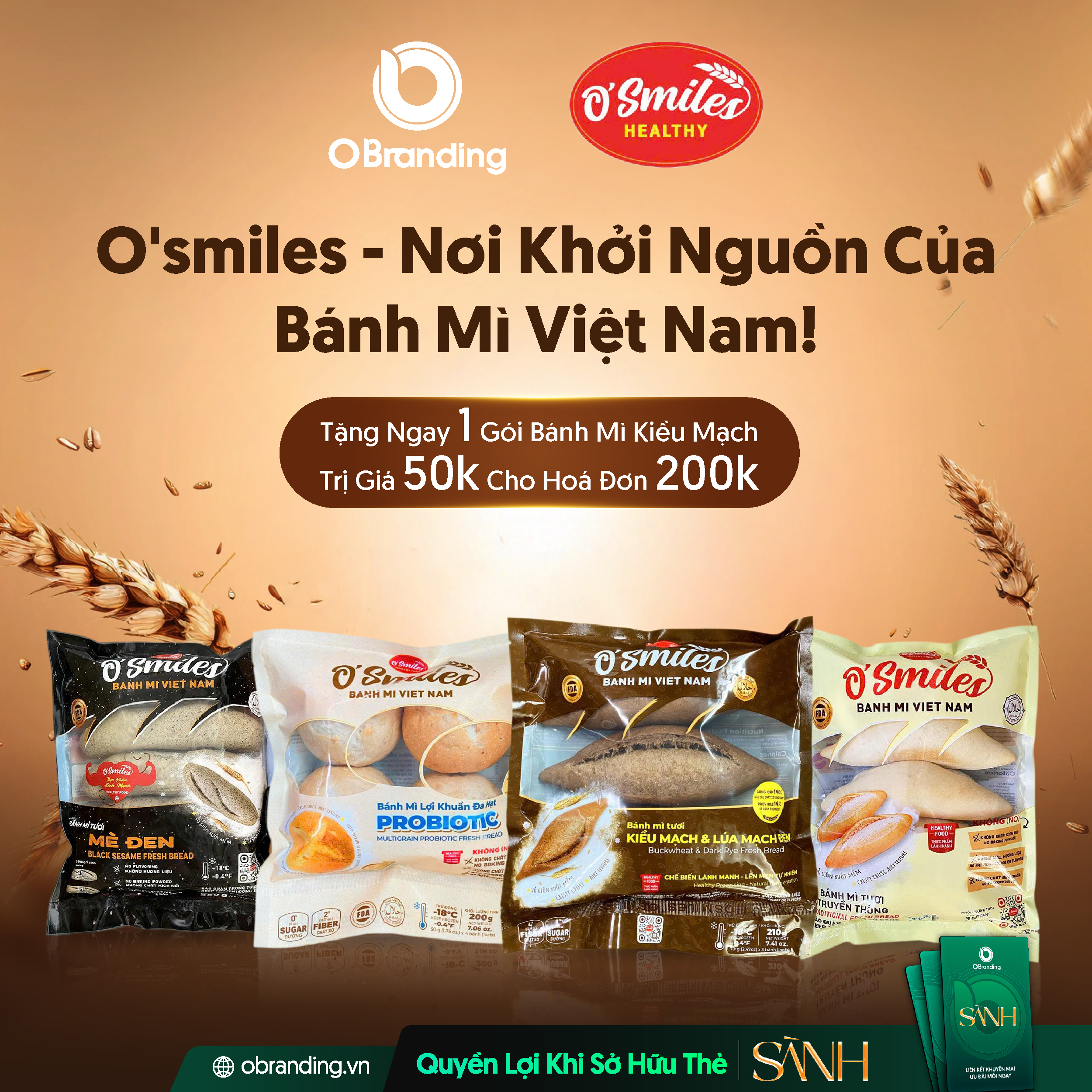 Hội viên ở hữu Thẻ Sành sẽ được tặng ngay 1 gói bánh mì Kiều Mạch trị giá 50.000 VNĐ cho hóa đơn từ 200.000 đồng khi mua sản phẩm của Công ty Cổ phần Những Nụ Cười Việt Nam trên nền tảng OBranding.