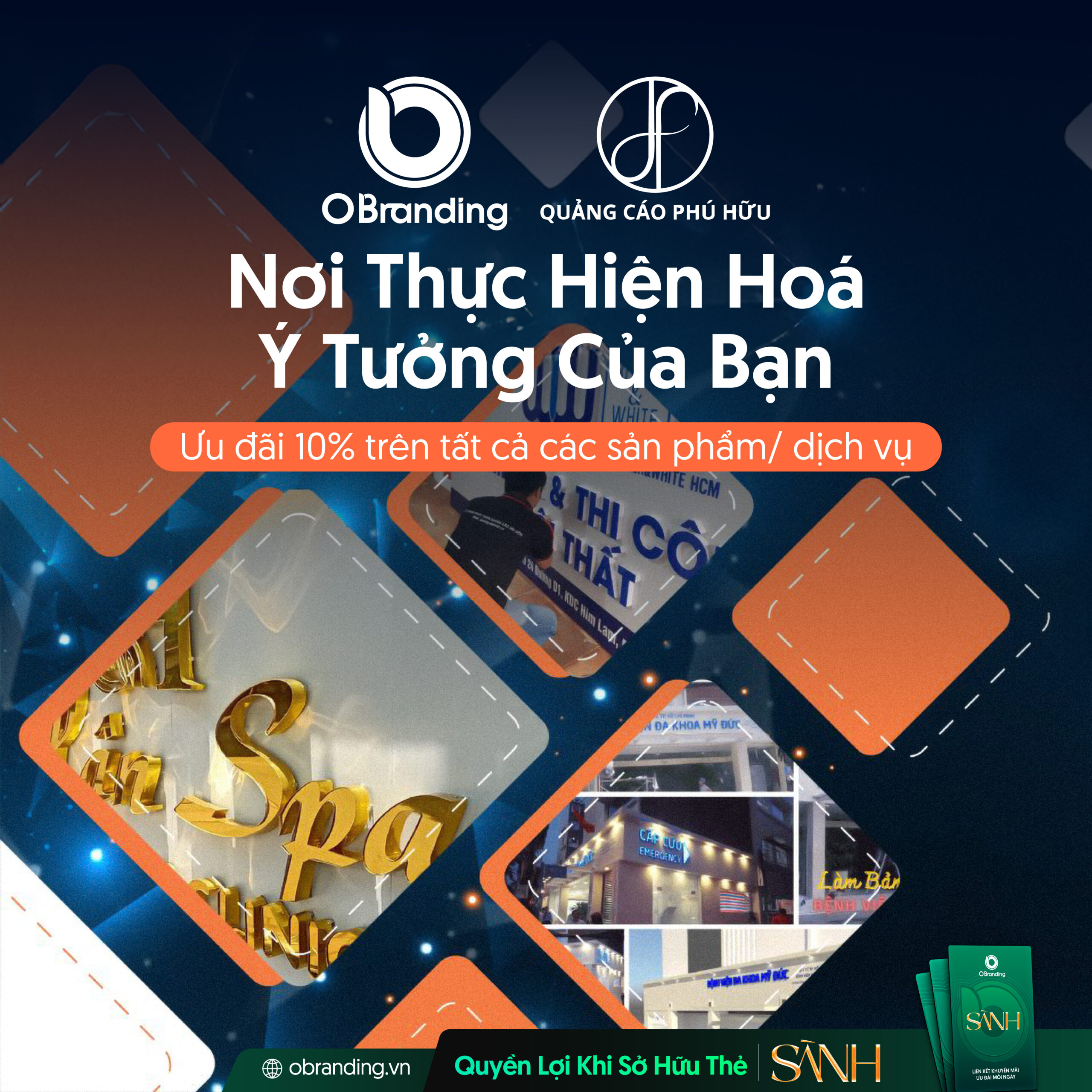 Khách hàng sở hữu Thẻ Sành sẽ nhận được ưu đãi đặc biệt giảm 10% cho tất cả các sản phẩm/ dịch vụ khi sử dụng sản phẩm và dịch vụ của Quảng cáo Phú Hữu thông qua nền tảng OBranding.
