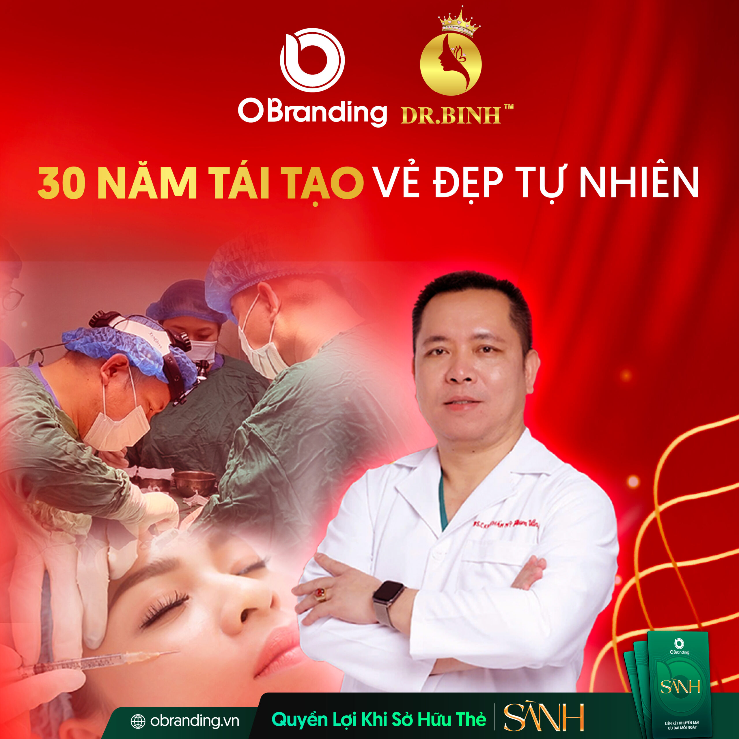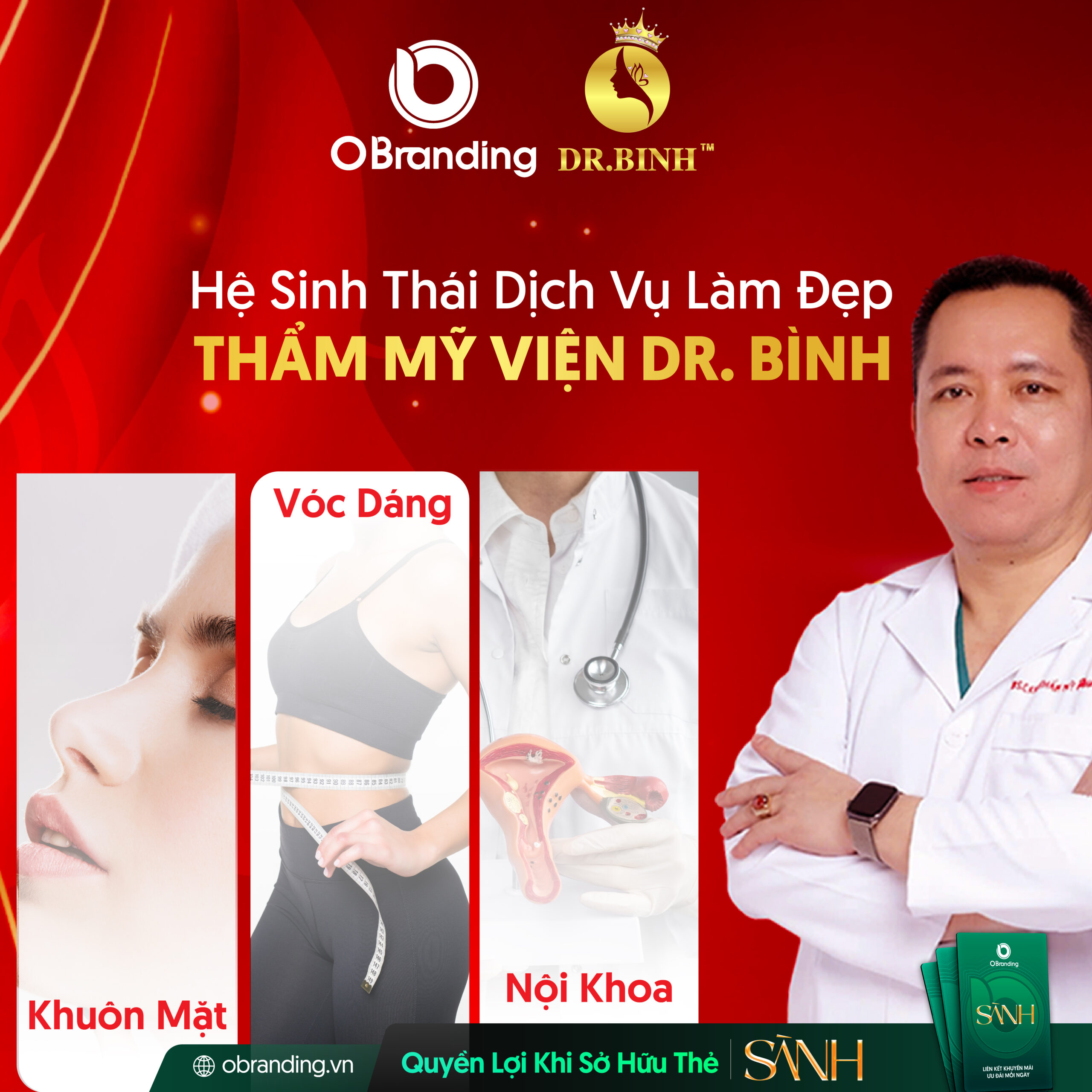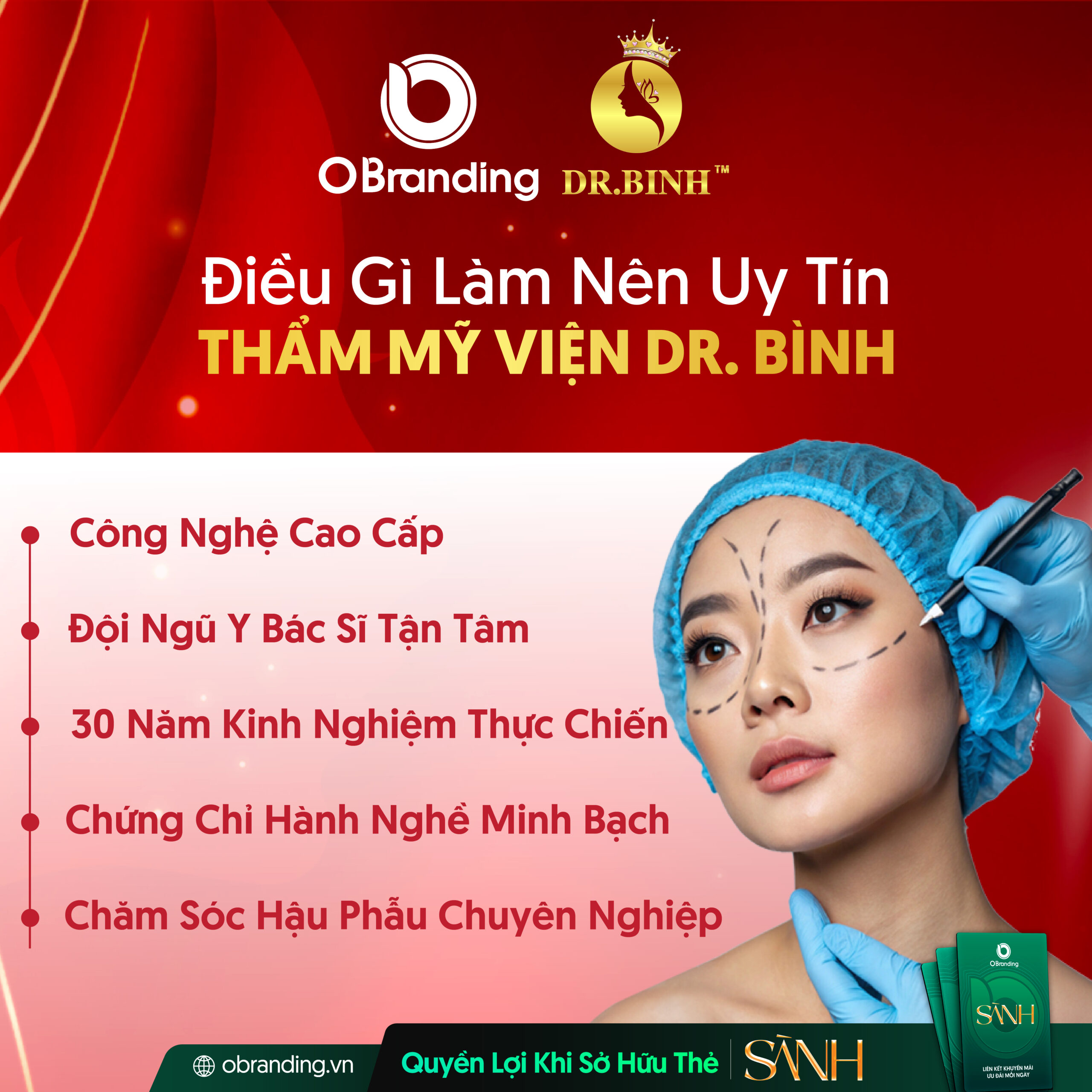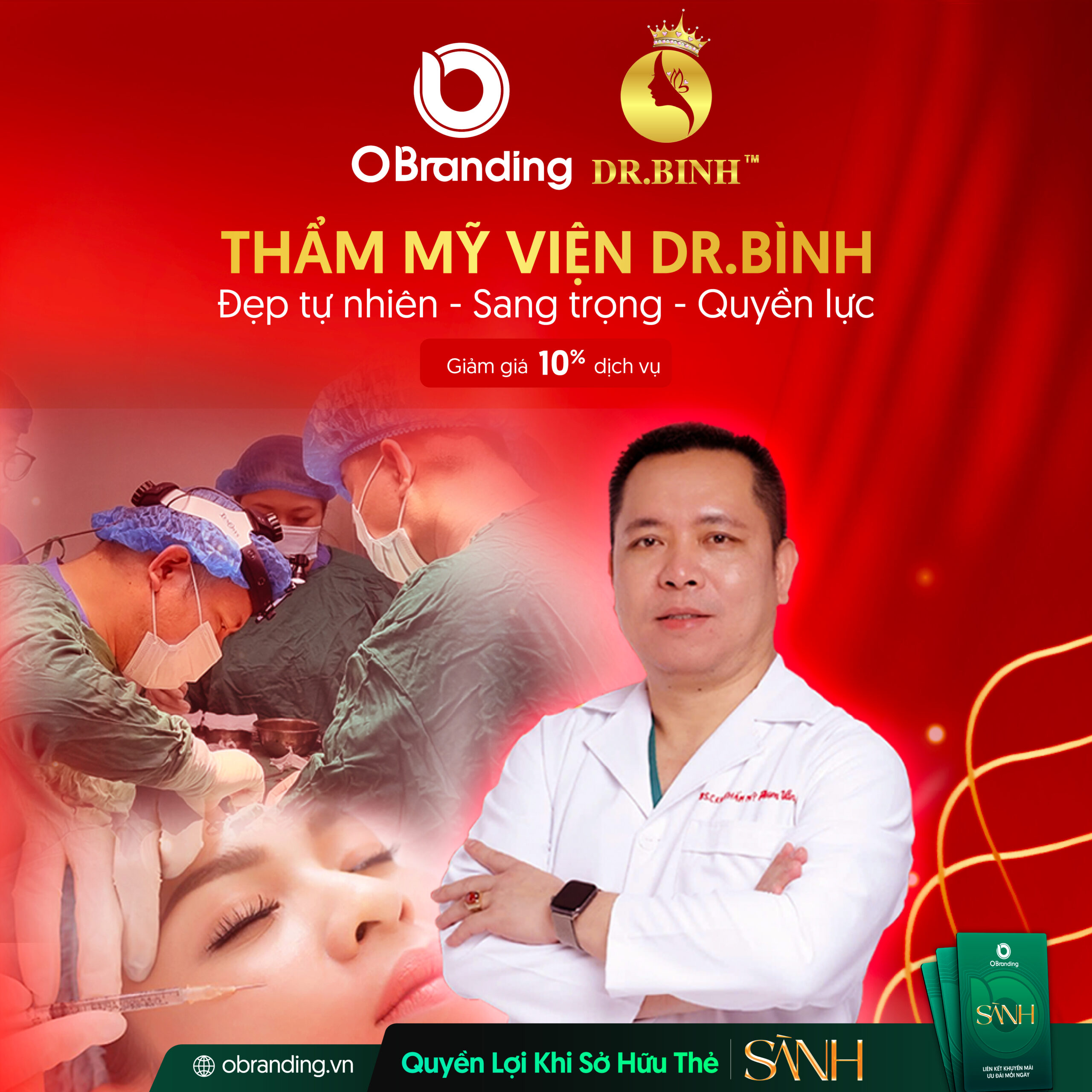 Giờ đây, bạn có thể dễ dàng đặt lịch và sử dụng dịch vụ của Thẩm mỹ viện Dr. Bình qua OBranding – nền tảng thương mại điện tử hỗ trợ doanh nghiệp làm đẹp trong thời đại số. Chỉ cần sở hữu Thẻ Sành, bạn sẽ được giảm 10% cho mọi dịch vụ – từ nâng mũi, cắt mí, đến các liệu pháp trẻ hóa chuyên sâu.